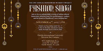 The Bandhwari Women's Project Fashion Show is our signature gala, bringing the community together for an unforgettable evening of culture, style, and purpose. Guests will enjoy browsing local vendors, savoring a catered Indian dinner, and experiencing captivating cultural performances. The night also features an exciting silent auction with unique items and experiences up for bid.