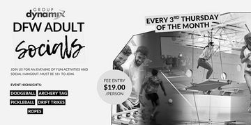 The go-to hangout spot for adults in DFW! Located at GDX, we'll have activities like ropes, dodgeball, archery tag, & more from 6:30-8:30pm.