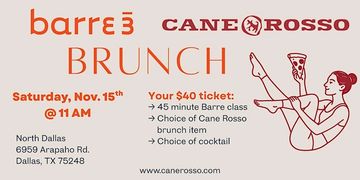 Join Cane Rosso and barre3 Richardson for Brunch on Saturday, November 15th!! Includes a 45 minute workout, plus brunch food & drinks!